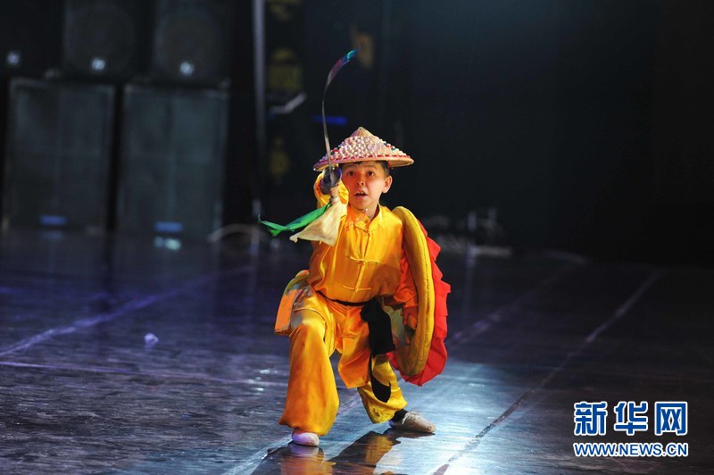 1月18日晚,烏茲別克斯坦首都塔什干人民友誼宮,烏茲別克斯坦中華民族文化中心武術隊隊員在表演武術。