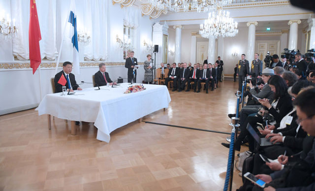 4月5日,國家主席習(xí)近平在赫爾辛基同芬蘭總統(tǒng)尼尼斯托舉行會談。這是會談后,兩國元首共同會見記者。(新華社記者張鐸攝)