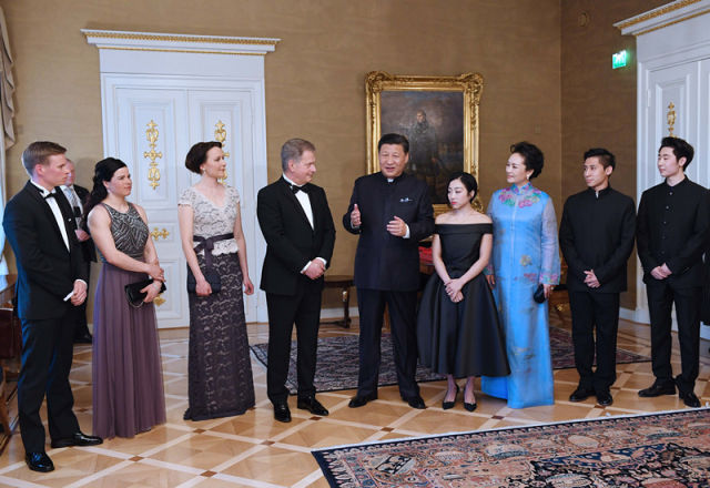 當(dāng)?shù)貢r間4月5日晚,國家主席習(xí)近平和芬蘭總統(tǒng)尼尼斯托在赫爾辛基共同會見剛剛參加完2017年世界花樣滑冰錦標(biāo)賽的中芬兩國冰雪運動員代表。習(xí)近平夫人彭麗媛和尼尼斯托夫人豪吉歐參加會見。(新華社記者饒愛民攝)