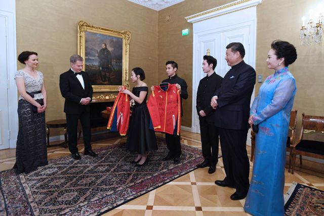 當(dāng)?shù)貢r間4月5日晚,國家主席習(xí)近平和芬蘭總統(tǒng)尼尼斯托在赫爾辛基共同會見剛剛參加完2017年世界花樣滑冰錦標(biāo)賽的中芬兩國冰雪運動員代表。習(xí)近平夫人彭麗媛和尼尼斯托夫人豪吉歐參加會見。這是中國運動員向尼尼斯托和夫人豪吉歐贈送運動衣。(新華社記者饒愛民攝)(新華社客戶端報道)