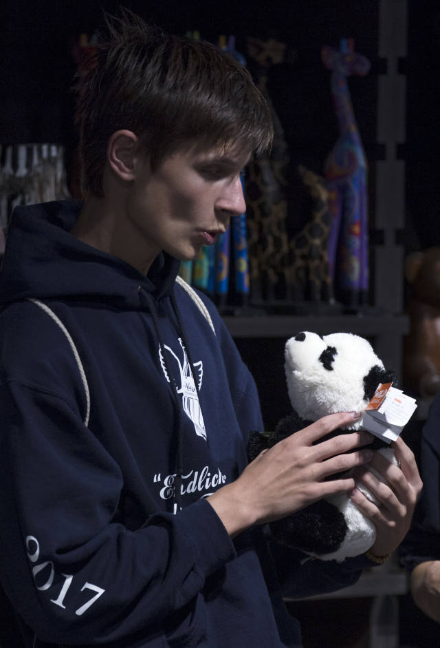 ↑7月5日,在德國柏林動物園,一名顧客手拿熊貓玩偶。
