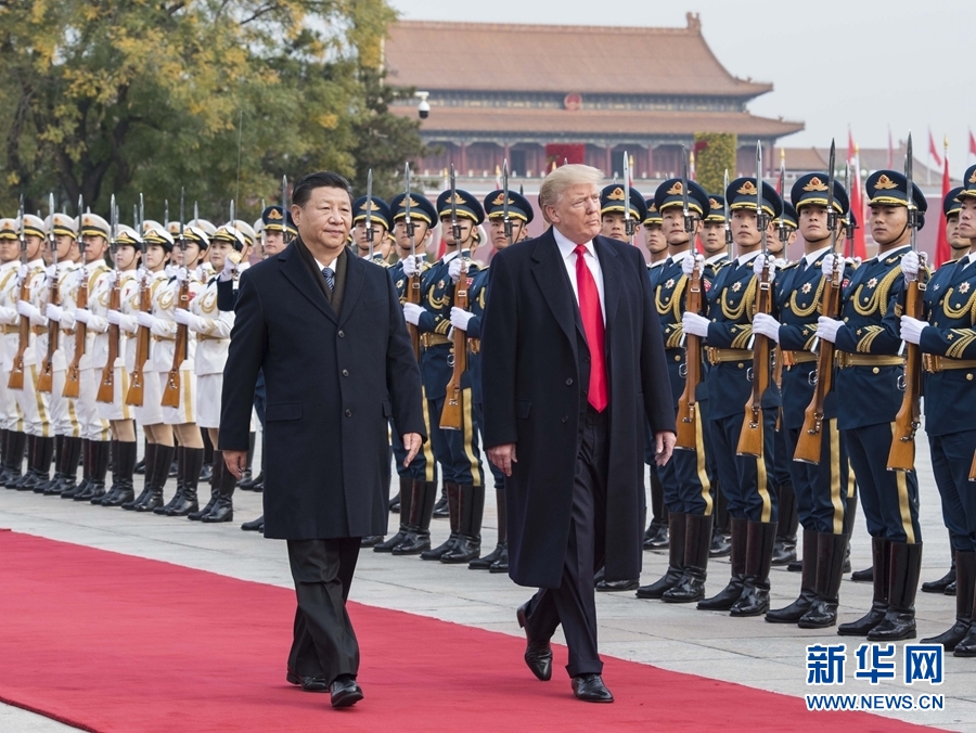 11月9日,國家主席習近平在北京人民大會堂東門外廣場舉行歡迎儀式,歡迎美利堅合眾國總統唐納德·特朗普對中國進行國事訪問。 新華社記者李濤 攝