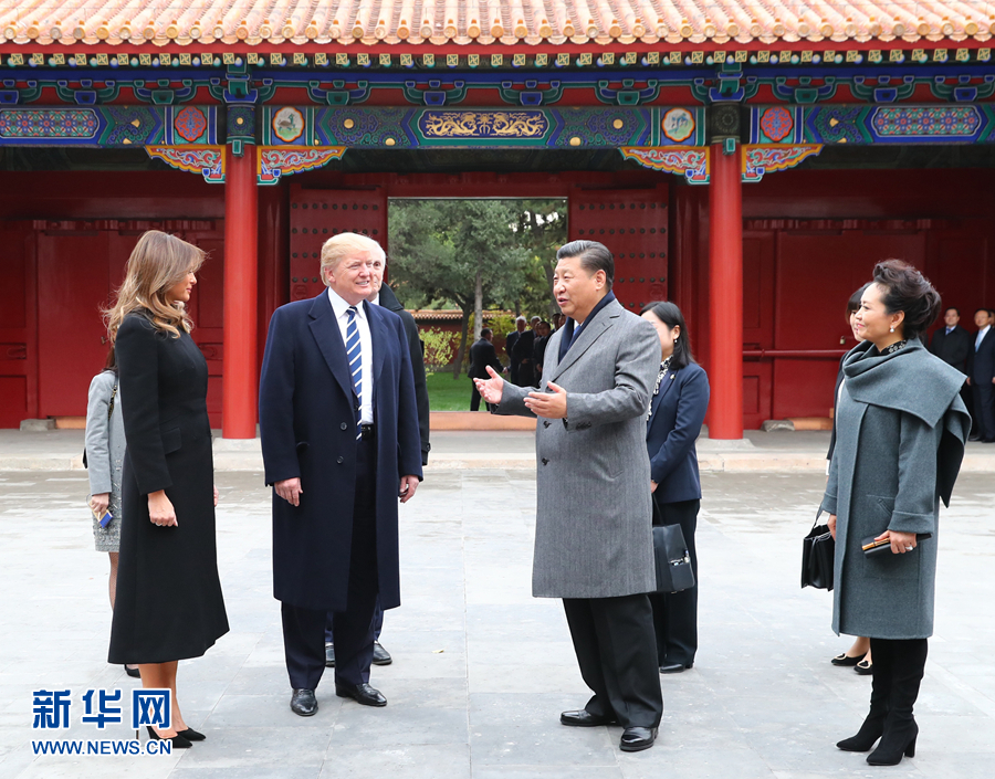 11月8日下午,國家主席習近平和夫人彭麗媛在北京故宮博物院迎接來華進行國事訪問的美國總統特朗普和夫人梅拉尼婭。兩國元首夫婦在寶蘊樓簡短茶敘。新華社記者謝環馳攝