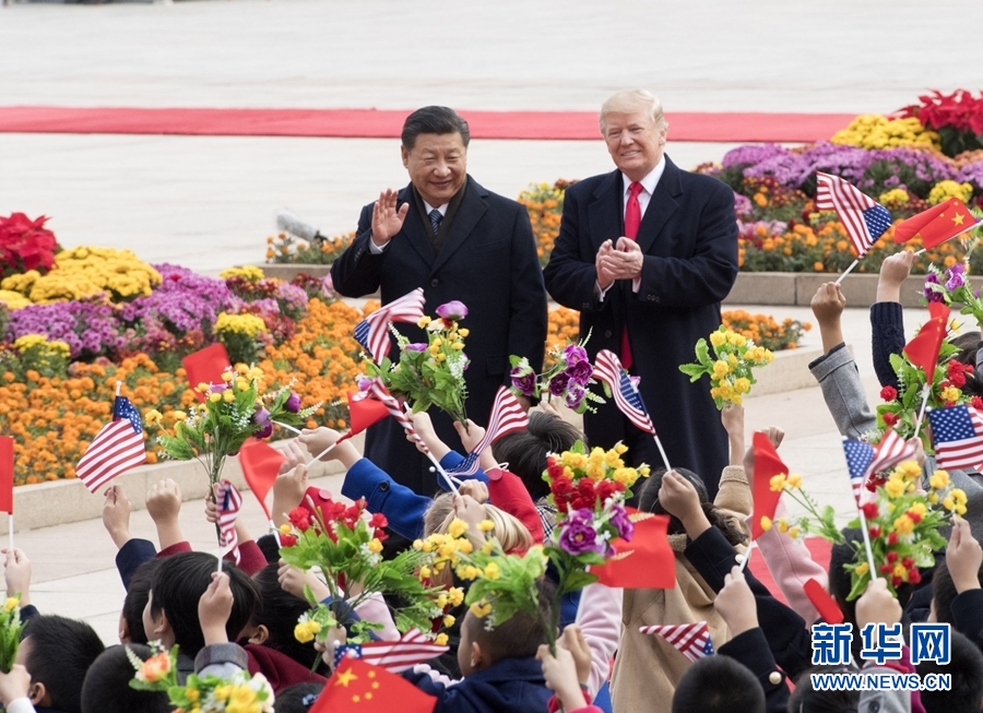 11月9日,國家主席習近平在北京人民大會堂東門外廣場舉行歡迎儀式,歡迎美利堅合眾國總統唐納德·特朗普對中國進行國事訪問。 新華社記者李學仁 攝
