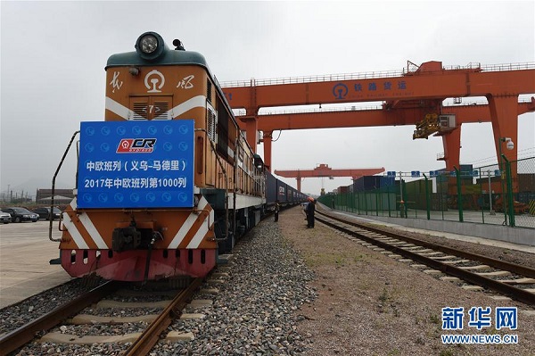 5月13日,2017年第1000列中歐班列從義烏西站駛出。當日,X8024次中歐班列(義烏-馬德里)從浙江義烏鐵路西站鳴笛駛出。這列滿載小商品、服裝等貨物的列車是2017年開行的第1000列中歐班列。中國鐵路總公司統計顯示,2017年中歐班列開行數量較去年同期增加612列,增長158%。新華社發(龔獻明 攝)