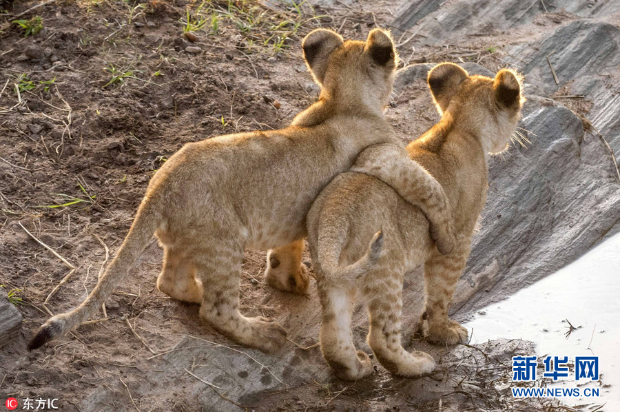 1月2日報道(具體拍攝時間不詳),肯尼亞馬賽馬拉國家保護區,64歲的攝影師Ingo Gelach在當地拍攝到一組有趣又暖心的照片。畫面中,兩頭小獅子站在水邊,似乎正考慮跨越面前的水域。其中一頭獅子用前腳搭在同伴的肩膀上,似乎在表達友好,又似是在鼓勵同伴不要害怕,勇敢地跨過去。(圖片來源:東方IC)