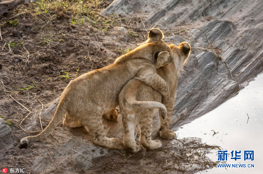 1月2日報道(具體拍攝時間不詳),肯尼亞馬賽馬拉國家保護區(qū),64歲的攝影師Ingo Gelach在當(dāng)?shù)嘏臄z到一組有趣又暖心的照片。畫面中,兩頭小獅子站在水邊,似乎正考慮跨越面前的水域。其中一頭獅子用前腳搭在同伴的肩膀上,似乎在表達(dá)友好,又似是在鼓勵同伴不要害怕,勇敢地跨過去。(圖片來源:東方IC)
