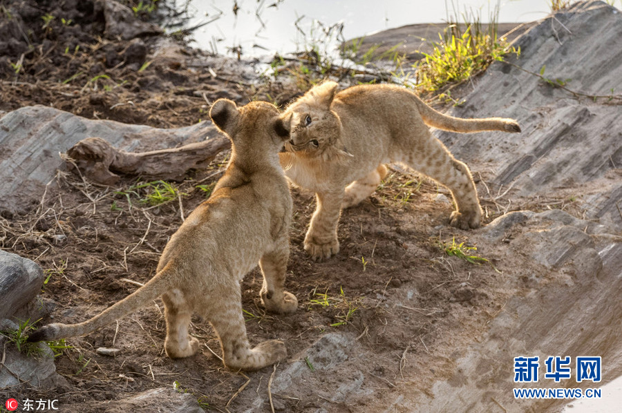 1月2日報道(具體拍攝時間不詳),肯尼亞馬賽馬拉國家保護區,64歲的攝影師Ingo Gelach在當地拍攝到一組有趣又暖心的照片。畫面中,兩頭小獅子站在水邊,似乎正考慮跨越面前的水域。其中一頭獅子用前腳搭在同伴的肩膀上,似乎在表達友好,又似是在鼓勵同伴不要害怕,勇敢地跨過去。(圖片來源:東方IC)