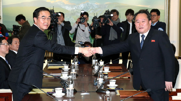 當地時間9日10時(北京時間9時),韓國和朝鮮代表在板門店韓方一側“和平之家”開始舉行高級別會談,討論朝方派代表團參加平昌冬奧會、南北關系改善等議題。這是2015年12月韓朝副部長級會談之后雙方首次舉行政府間會談。