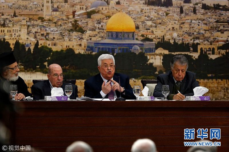 1月14日,約旦河西岸拉馬拉,巴勒斯坦總統阿巴斯在巴勒斯坦中央委員會會議上發表講話,并稱以色列已經“終止”了奧斯陸協議。(圖片來源:視覺中國)