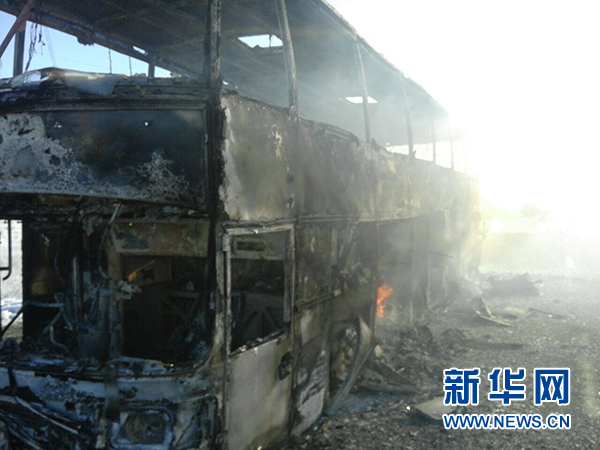 哈薩克斯坦內務部緊急情況委員會提供的照片顯示,這輛大客車已焚毀,只剩下空殼。目前,哈緊急情況委員會尚未透露大客車起火原因。