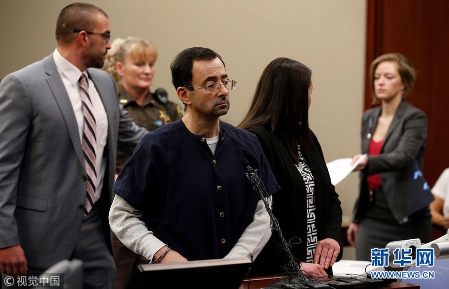 1月24日,美國密歇根州蘭辛,美國奧運體操隊前隊醫拉里·納沙因性侵被判處40-175年監禁。過去7天,超過150名女性向法官證實,自己曾是納沙的性侵對象,其中包括多名兒童。在法院宣讀的一份聲明中,納沙表示自己對受害者的歉意已“超出言語的表達范圍”。54歲的納沙1996年至2015年間在美國體操協會擔任醫師。(圖片來源:視覺中國)