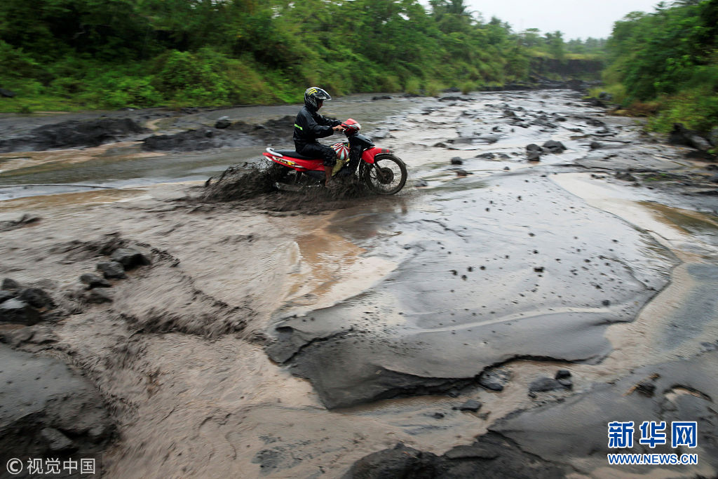 當地時間2018年1月27日,菲律賓阿爾拜省,民眾穿過混合著火山灰的泥漿河。(圖片來源:視覺中國)
