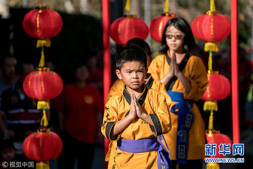 當(dāng)?shù)貢r(shí)間1月28日,美國洛杉磯,當(dāng)?shù)谿rove商場(chǎng)舉行少林武術(shù)表演以及其他中國文化類的演出,慶祝傳統(tǒng)新年,場(chǎng)外攤位還有傳統(tǒng)剪紙,捏面人,糖畫,彩繪等項(xiàng)目。圖為少林功夫表演。(圖片來源:視覺中國)
