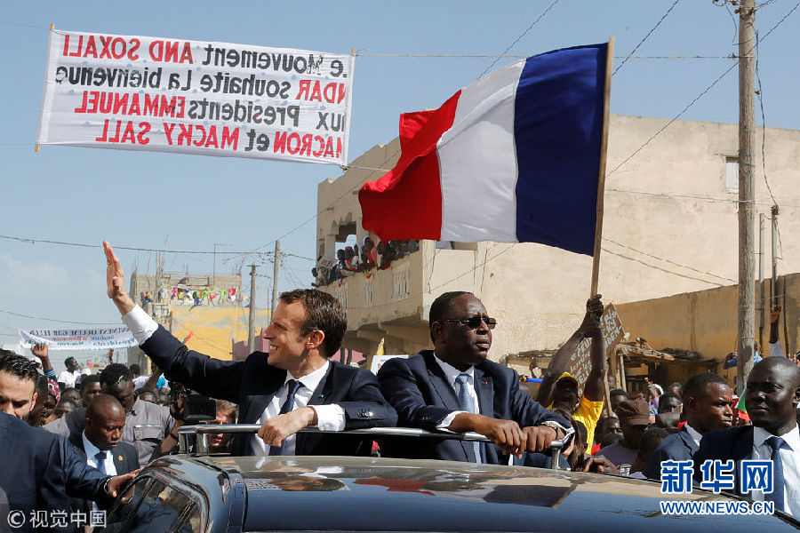 當(dāng)?shù)貢r間2月3日,塞內(nèi)加爾圣路易,塞內(nèi)加爾總統(tǒng)馬基·薩勒陪到訪的法國總統(tǒng)馬克龍造訪當(dāng)?shù)兀瑑扇顺塑囅蛎癖娭乱狻#▓D片來源:視覺中國)
