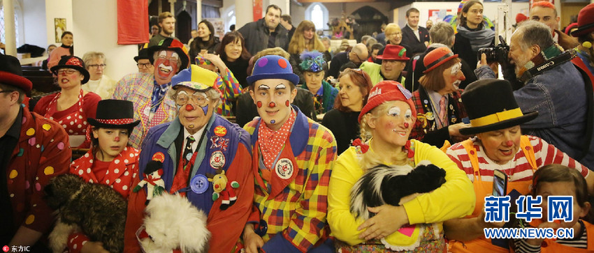 當(dāng)?shù)貢r(shí)間2月4日,英國(guó)倫敦,人們扮成小丑的模樣聚集在圣三一教堂,為英國(guó)“小丑之父”約瑟夫-格里馬爾迪(1778-1837)舉辦紀(jì)念會(huì)。(圖片來(lái)源:東方IC)