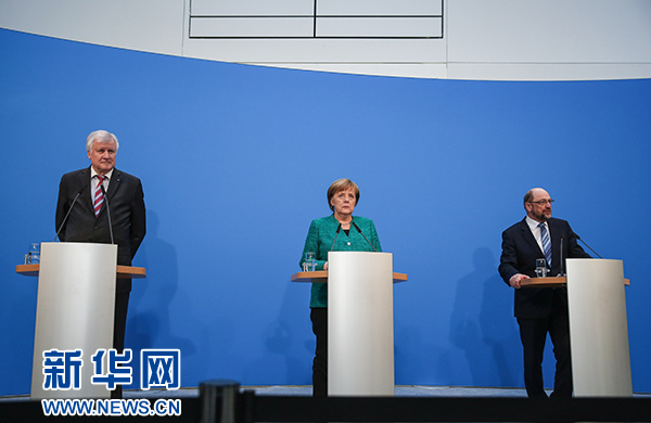 ??? 2月7日,在德國柏林的基民盟總部,德國總理、聯盟黨領導人默克爾(中),社會民主黨主席舒爾茨(右)和基社盟主席澤霍費爾出席新聞發布會。據德國媒體報道,德國聯盟黨(由基民盟和基社盟組成)和社會民主黨(社民黨)7日就聯合組閣協議達成一致。 新華社記者單宇琦攝
