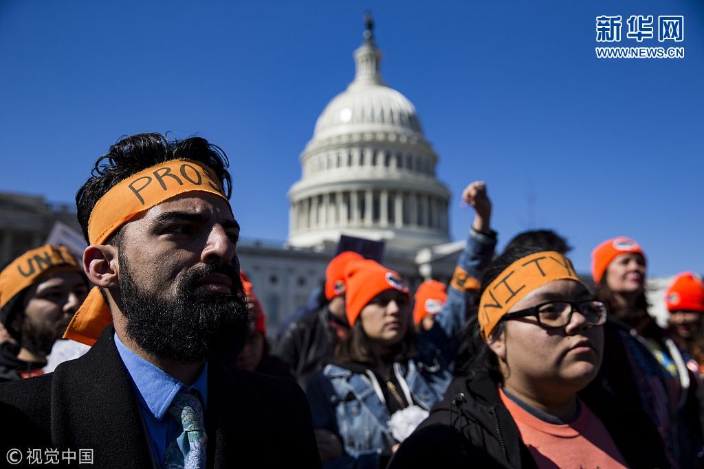 當(dāng)?shù)貢r間2018年3月5日,美國華盛頓,移民活動家在國會山舉行集會,抗議特朗普終結(jié)“夢想法案”計(jì)劃。(圖片來源:視覺中國)