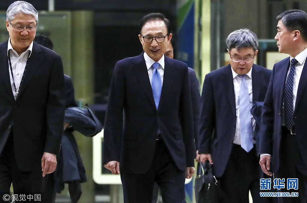 3月15日,韓國首爾,韓國前總統李明博在接受了檢方超過21小時的調查后返家。他涉嫌包括受賄、挪用公款等在內的20多項罪名,同時也是韓國第五位被檢方調查的前總統。(圖片來源:視覺中國)