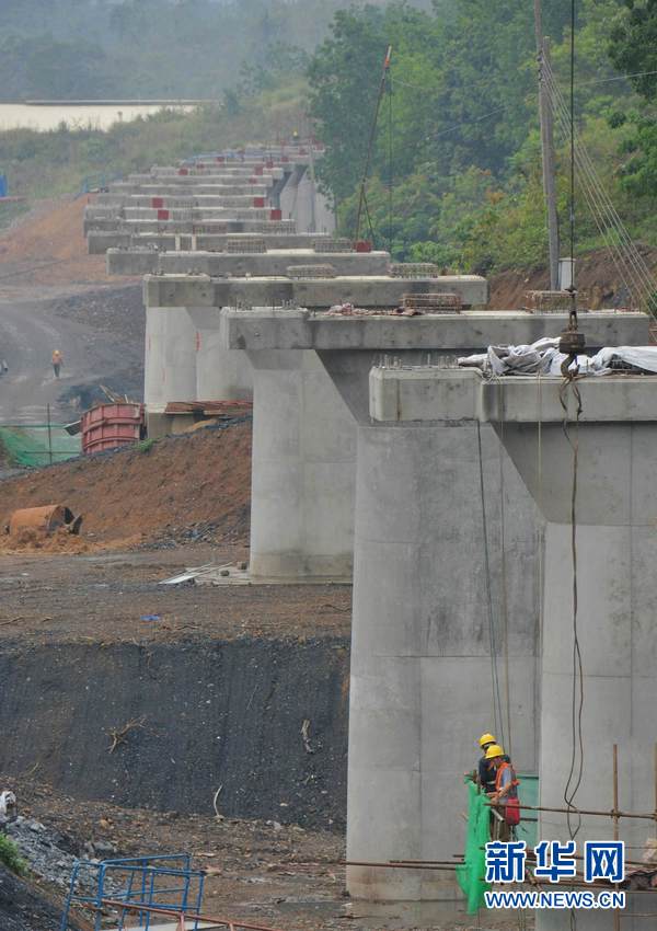 這是3月27日在老撾南塔省航拍的正在施工建設中的橋梁。新華網發 劉艾倫攝