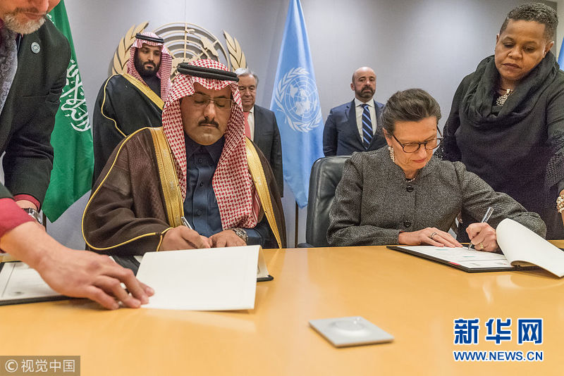 3月27日,美國紐約,沙特王儲穆罕默德·本·薩勒曼訪問聯合國總部,簽署向也門人道主義援助計劃自愿財政資助備忘錄。(圖片來源:視覺中國)