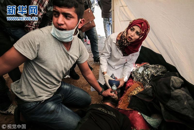 4月1日,加沙汗尤尼斯,在加沙地帶邊境沖突中受傷的巴勒斯坦人被送醫治療。巴勒斯坦人與以色列士兵30日在加沙地帶邊境爆發沖突,導致16名巴勒斯坦人死亡、上千人受傷。這天成為2014年巴以沖突后死傷最慘重的一天。(圖片來源:視覺中國)