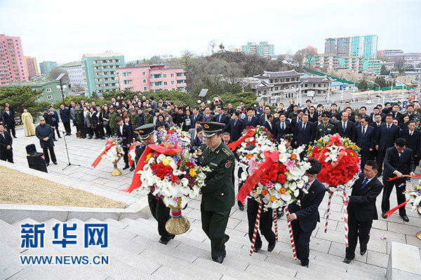 4月5日,在朝鮮平壤,中國(guó)駐朝鮮大使館在平壤友誼塔舉行敬獻(xiàn)花籃儀式,祭奠中國(guó)人民志愿軍烈士。新華社記者 程大雨 攝