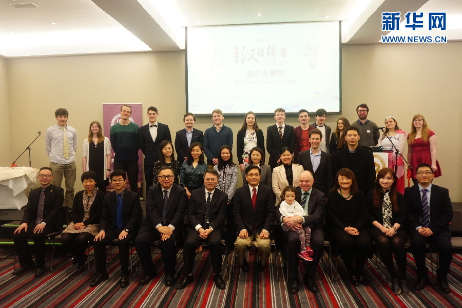 嘉賓和評委與參賽選手合影。4月7日,第17屆“漢語橋”世界大學生中文比賽愛爾蘭賽區(qū)選拔賽在首都都柏林舉行。新華網(wǎng)發(fā)