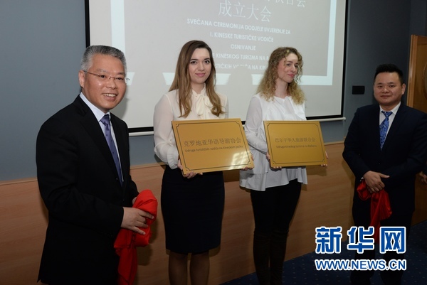 4月11日,中國(guó)駐克羅地亞大使胡兆明(左一)與克羅地亞華語(yǔ)導(dǎo)游協(xié)會(huì)會(huì)長(zhǎng)蔣曉亮(右一)在薩格勒布為當(dāng)天成立的克羅地亞華語(yǔ)導(dǎo)游協(xié)會(huì)和巴爾干華人旅游協(xié)會(huì)揭牌。新華社記者高磊 攝
