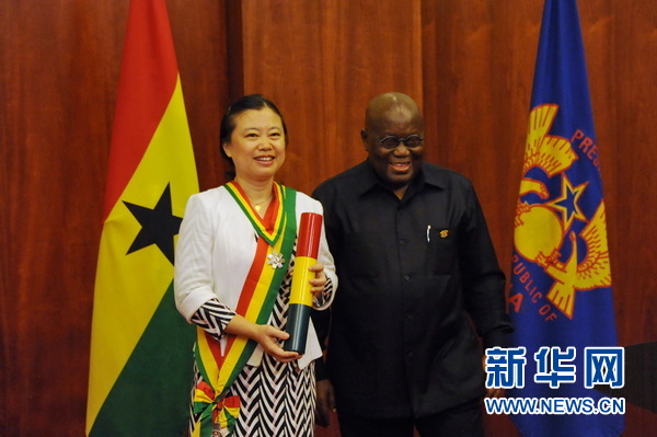 4月10日,加納總統(tǒng)阿庫福-阿多向中國駐加納大使孫保紅授予“加納之星”榮譽(yù)勛章。新華網(wǎng)記者石松 攝