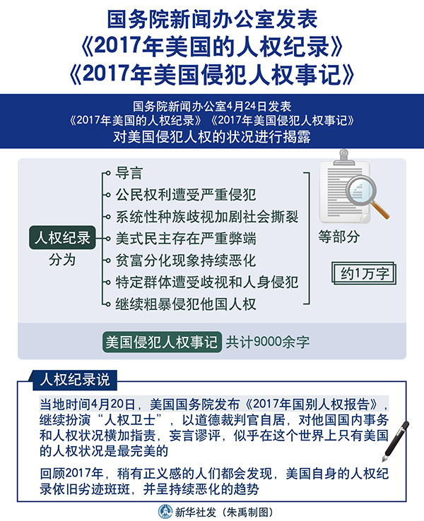 新華社北京4月24日電(記者黃小希、程卓)國務院新聞辦公室24日發表《2017年美國的人權紀錄》《2017年美國侵犯人權事記》,對美國侵犯人權的狀況進行揭露。