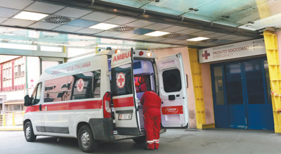 意大利羅馬一家大型綜合醫院,這里頻繁有救護車抵達運送病人。圖為其中一輛剛剛運送病人抵達急診室的急救車。記者 韓碩 攝
