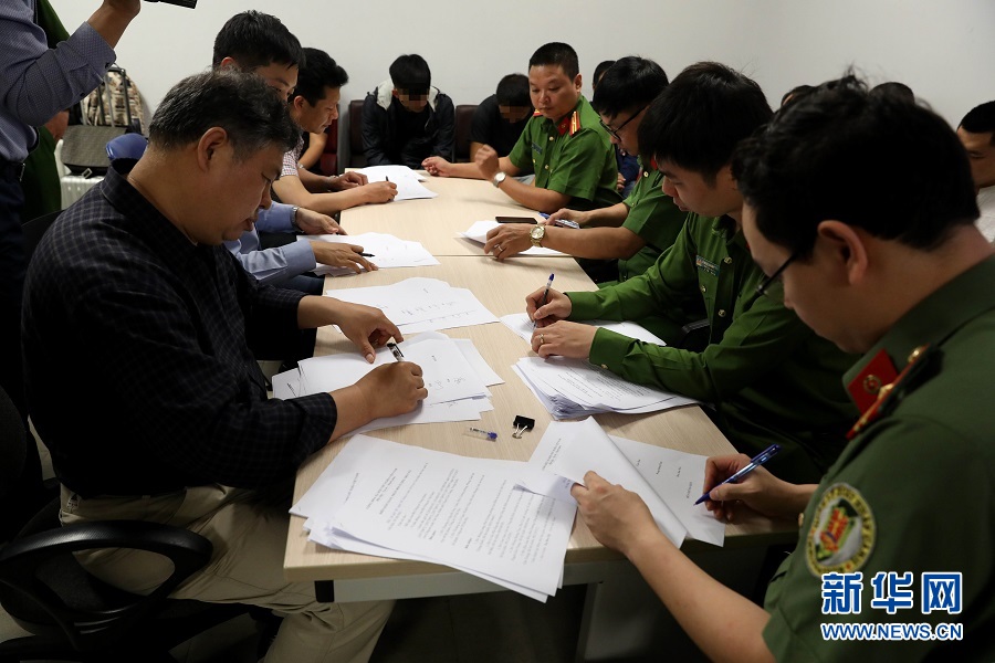 4月28日,中越警方簽署移交相關(guān)文件。當(dāng)日,越南警方在河內(nèi)內(nèi)排國際機(jī)場向中國警方工作組移交了許某等8名涉嫌詐騙罪的在逃嫌疑人。中國警方“獵狐行動(dòng)”在越南再獲新成果。新華社記者王迪攝