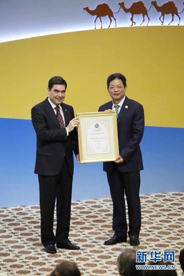 論壇開(kāi)幕式上,絲綢之路國(guó)際總商會(huì)主席呂建中代表該商會(huì)向別爾德穆哈梅多夫頒發(fā)“復(fù)興絲綢之路榮譽(yù)證書(shū)”。新華社記者 周良攝