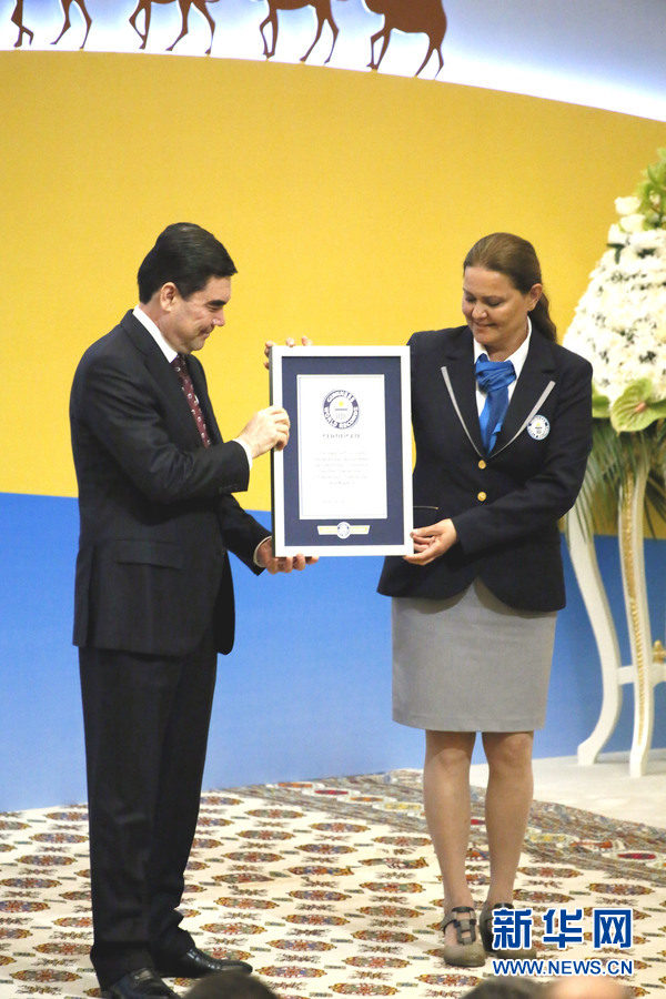 5月2日,世界吉尼斯紀(jì)錄總部的代表向土庫(kù)曼斯坦總統(tǒng)頒發(fā)相關(guān)證書(shū)。新華社記者 周良攝