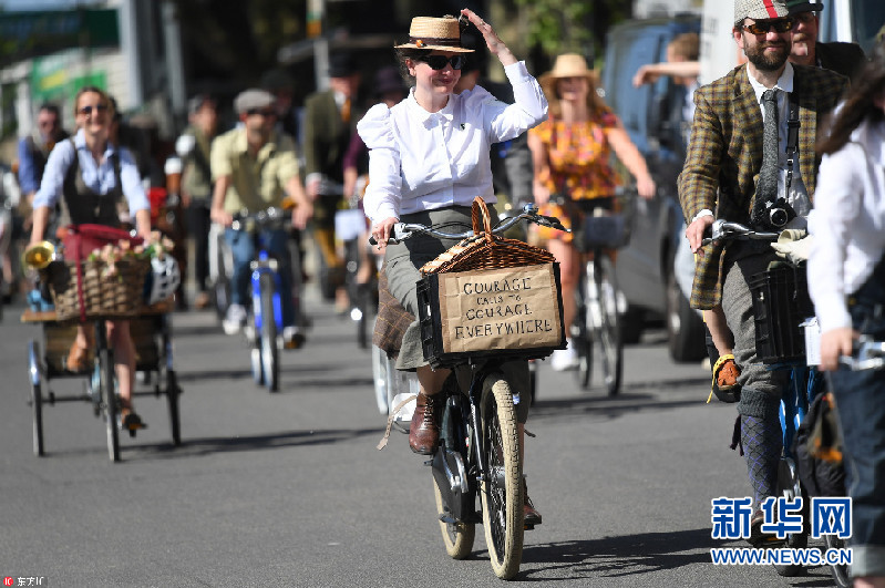 當地時間2018年5月5日,英國倫敦,當地舉辦復古騎行活動,民眾身穿花呢子服裝騎車穿行在倫敦街頭。今年是該活動舉辦十周年。(圖片來源:東方IC)