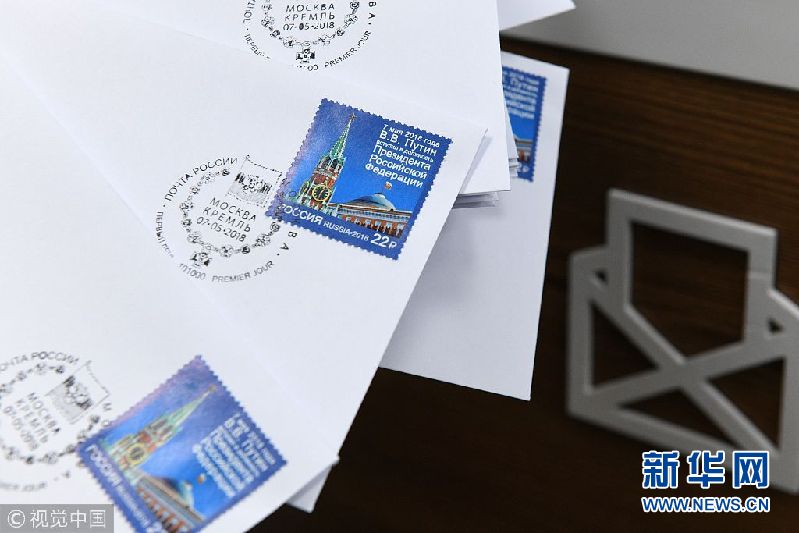 當地時間2018年5月7日,俄羅斯莫斯科,俄羅斯發行普京就職紀念郵票。(圖片來源:視覺中國)