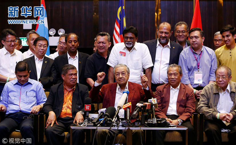 當?shù)貢r間2018年5月9日,馬來西亞吉隆坡,馬哈蒂爾代表希望聯(lián)盟召開新聞發(fā)布會。9日,馬來西亞國會大選結(jié)束。10日凌晨官方點票結(jié)果顯示,前總理馬哈蒂爾(Mahathir)帶領(lǐng)的希望聯(lián)盟取得112席簡單多數(shù)國會議席,足以籌組政府及勝出大選,并終結(jié)執(zhí)政國民陣線長達60年的管治。現(xiàn)總理納吉布領(lǐng)導的國民陣線僅獲得76席。(圖片來源:視覺中國)