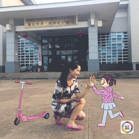 2017年,30歲的護(hù)士張曉在非洲塞拉利昂中塞友好醫(yī)院門前和自己女兒的畫像“合影”。