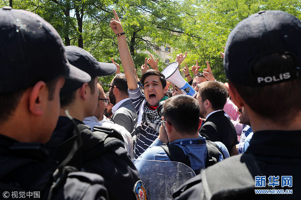 5月15日,土耳其安卡拉,示威者在以色列領(lǐng)事館附近投擲雞蛋和石塊,抗議美國駐以色列使館遷至耶路撒冷。(圖片來源:視覺中國)