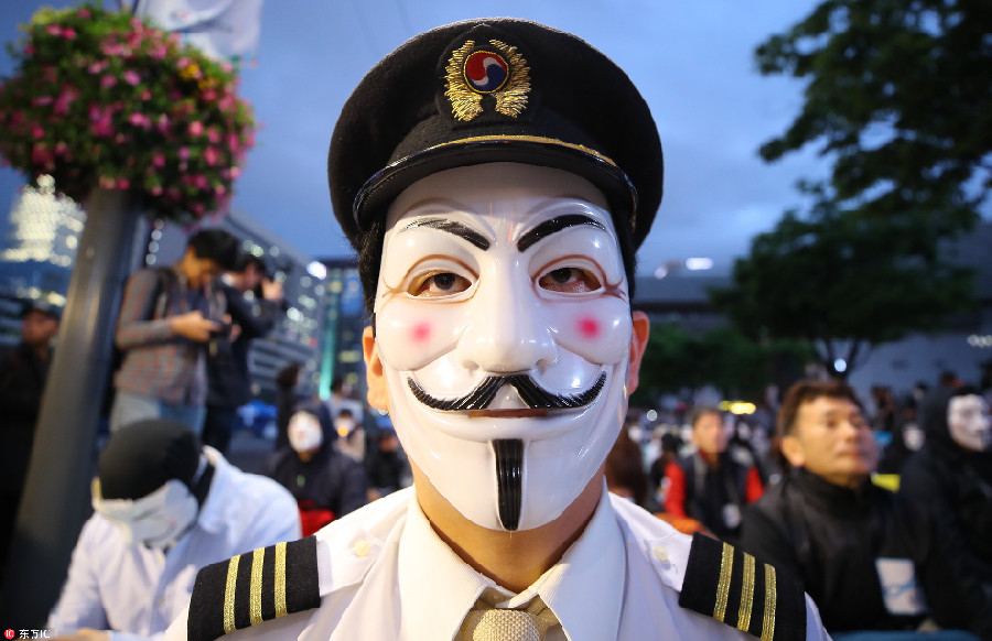 當(dāng)?shù)貢r(shí)間2018年5月18日,韓國首爾,大韓航空有限公司的飛行員戴著蓋伊·福克斯面具,在首爾市區(qū)集會(huì)抗議,反對(duì)大韓航空會(huì)長(zhǎng)兼首席執(zhí)行官趙亮鎬及其家庭。