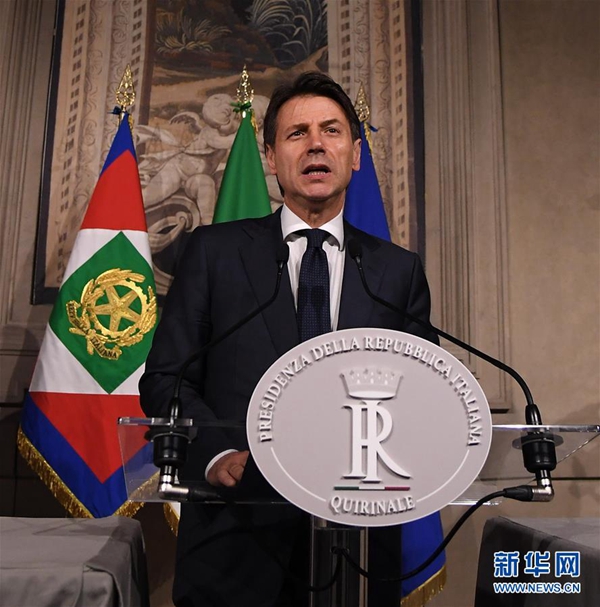 5月27日,在意大利首都羅馬,意新任總理孔特發(fā)表講話。據(jù)當(dāng)?shù)孛襟w報道,孔特27日晚間與總統(tǒng)馬塔雷拉會面并提交擬定的內(nèi)閣成員名單時,馬塔雷拉否決了由意大利聯(lián)盟黨和五星運動力推的持疑歐立場的經(jīng)濟學(xué)家保羅·薩沃納出任財政部長。孔特向總統(tǒng)提出放棄組閣任務(wù)請求,請求得到總統(tǒng)確認。新華社發(fā)(阿爾貝托·林格里亞攝)