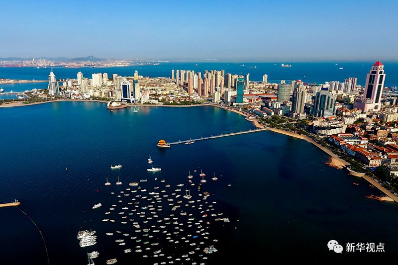 這是2018年5月4日無人機拍攝的棧橋和青島灣。新華社記者郭緒雷攝
