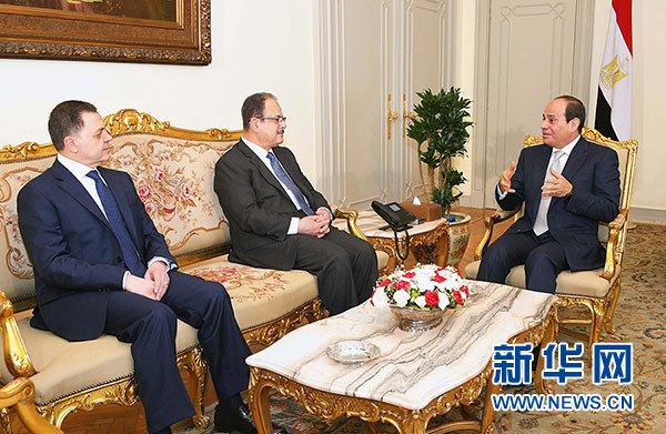 6月14日,在埃及首都開羅,埃及總統塞西(右一)和本屆內閣新當選成員內政部長馬哈茂德·陶菲克(左一)、前任內政部長阿卜杜勒·加法爾(左二)交談。新華社/中東社