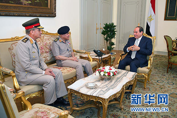 6月14日,在埃及首都開羅,埃及總統塞西(右一)和本屆內閣新當選成員國防部長穆罕默德·扎基(左一)和前任國防部長西德基·蘇卜希(左二)交談。新華社/中東社