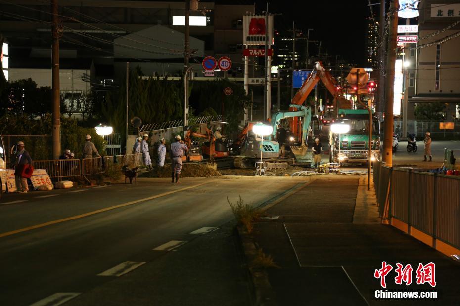6月18日,日本大阪府發生6.1級地震。圖為位于震源附近的高槻市一處路面出現凹陷,相關部門正連夜進行搶修。中新社記者 呂少威 攝