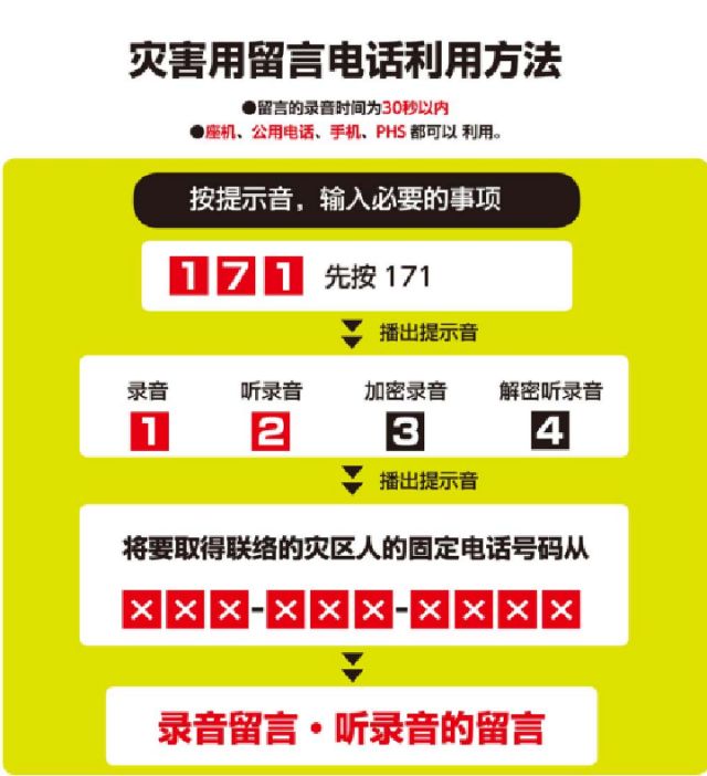強(qiáng)震往往造成通信中斷。為方便民眾震后互相確認(rèn)平安,日本政府設(shè)置了災(zāi)害用留言電話。若震后通信中斷,可撥打171留言或收聽親友留言,英文版介紹請見:http://www.ntt-east.co.jp/en/saigai/voice171/index.html