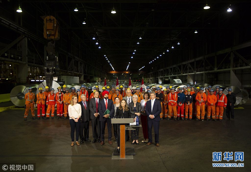 當地時間2018年6月29日,加拿大漢密爾頓,加拿大外交部長弗里蘭、經濟發展部長貝恩斯和勞工部長哈伊杜造訪斯特爾科鋼鐵公司,并共同宣布從7月1日起,加拿大將對約126億美元從美國進口的商品加征關稅,以報復特朗普政府對加拿大鋼鋁產品加征關稅。他們還表示,加拿大政府將向本國鋼鋁產業和制造業提供約15億美元財政援助。(圖片來源:視覺中國)