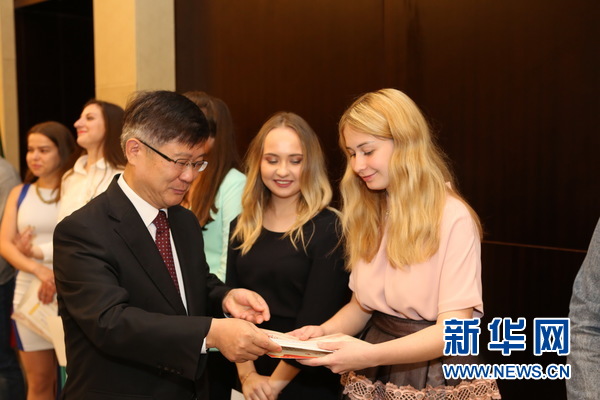 中國駐白俄羅斯大使崔啟明向白俄羅斯學生頒發(fā)獎學金。新華網(wǎng)記者 魏忠杰攝