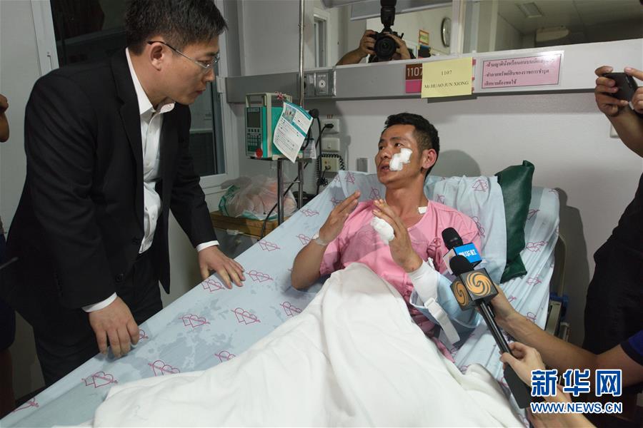 7月7日凌晨,在泰國普吉島,翻船事故幸存者黃俊雄向中國駐泰國大使呂?。ㄗ螅┗貞浱由洑v。新華社記者秦晴 攝